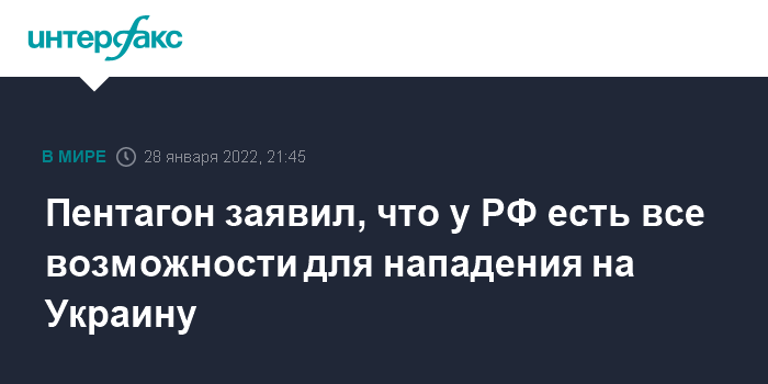 Москва. 28 января. INTERFAX.RU - Администрация США по-прежнему не определила, намерена ли Россия нападать на Украину, однако полагает, что с военной точки зрения у Москвы теперь есть все для совершения подобной атаки, заявил в пятницу глава Пентагона Ллойд Остин.