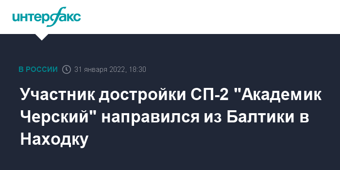 Москва. 31 января. INTERFAX.RU - Краново-монтажное трубоукладочное судно "Газпрома" "Академик Черский", которое выполняло часть работ по достройке магистрали "Северный поток 2", покинуло Балтийское море и начало многомесячный переход на российский Дальний Восток.