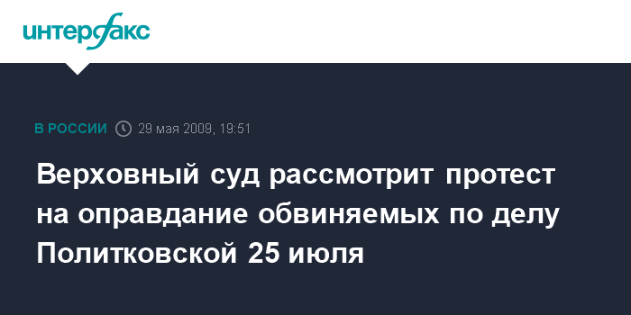 Москва. 29 мая. INTERFAX.RU - Верховный суд РФ 25 июня рассмотрит протест Генпрокуратуры РФ на оправдательный приговор по делу об убийстве Анны Политковской, сообщила "Интерфаксу" адвокат потерпевших Анна Ставицкая.