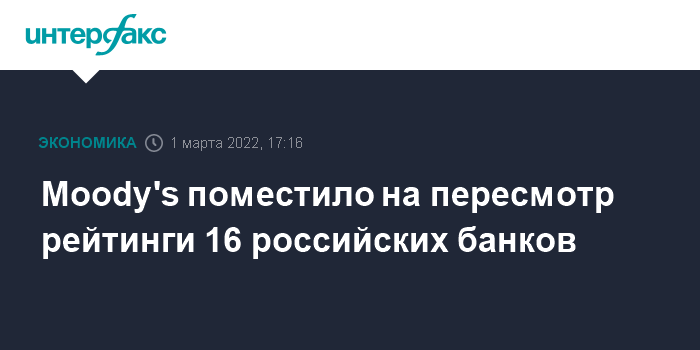Москва. 1 марта. INTERFAX.RU - Агентство Moody's Investors Service сообщило, что поставило на пересмотр с возможностью снижения рейтинг 16 российских банков.