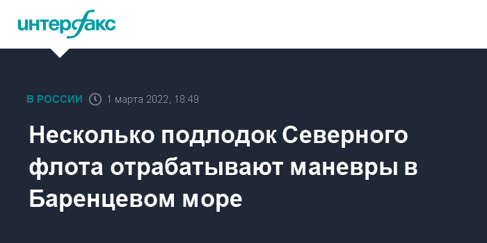 Москва. 1 марта. INTERFAX.RU - Экипажи нескольких атомных подводных лодок АПЛ Северного флота (СФ) отрабатывают в Баренцевом море учебно-боевые задачи, сообщил флот.