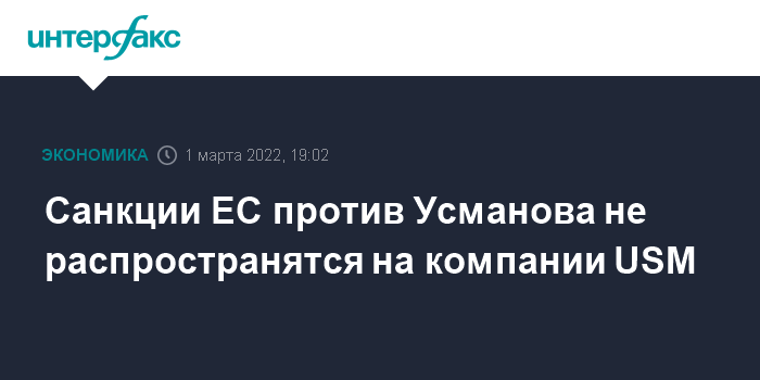 "Отметим, что ограничительные меры, введенные ЕС в отношении Алишера Усманова, носят персональный характер и не окажут влияния на компанию "Металлоинвест". Алишер Усманов владеет менее 50% уставного капитала головной компании холдинга "ЮэСэМ" и не контролирует предприятия группы. Таким образом, внесение Алишера Усманова в санкционные списки ЕС не распространяет действие соответствующих санкций на компании холдинга "ЮэСэМ" - говорится в заявлении "Металлоинвеста".