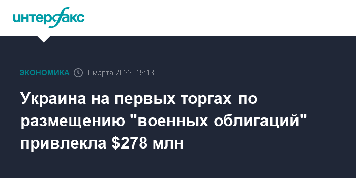 Москва. 1 марта. INTERFAX.RU - Украина 1 марта провела первый аукцион по размещению "военных облигаций" внутреннего государственного займа, привлекла 8,122 млрд гривен (около $278 млн по текущему курсу).
