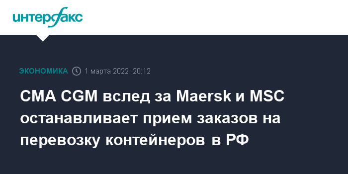 Ранее во вторник о приостановке приема заявок в РФ заявили швейцарская Mediterranean Shipping Company (MSC) и датская Maersk.