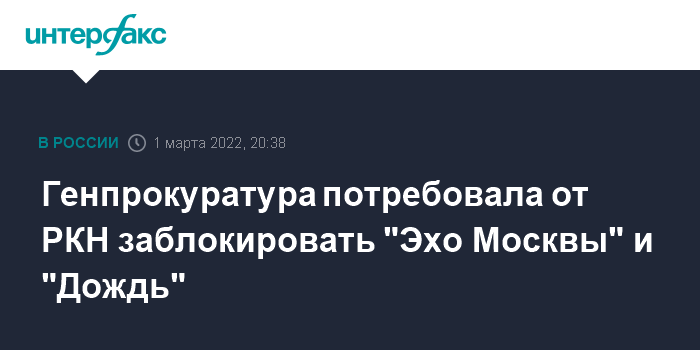 Москва. 1 марта. INTERFAX.RU - Генпрокуратура потребовала от РКН заблокировать "Эхо Москвы" и "Дождь" (признан СМИ-иноагентом).