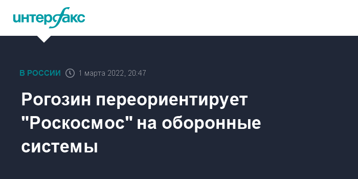 Москва. 1 марта. INTERFAX.RU - Из-за санкций "Роскосмос" сосредоточит освободившиеся из-за сворачивания сотрудничества с Европой и США ресурсы на создании оборонных систем, пообещал в своем телеграм-канале глава госкорпорации Дмитрий Рогозин.