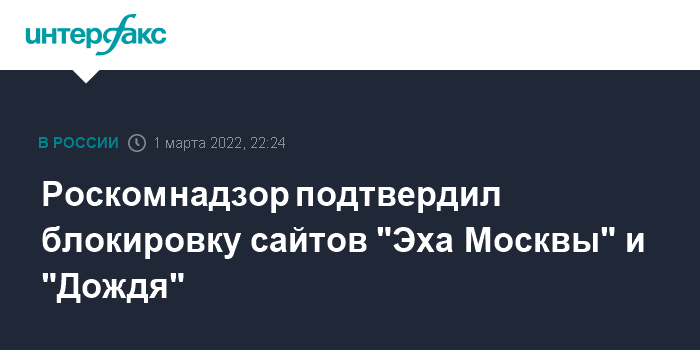 Москва. 1 марта. INTERFAX.RU - Роскомнадзор подтвердил, что заблокировал в России доступ к сайтам радиостанции "Эхо Москвы" и телеканала "Дождь" (внесен Минюстом в реестр СМИ-иноагентов) по требованию Генпрокуратуры. Это "Интерфаксу" подтвердил представитель ведомства.