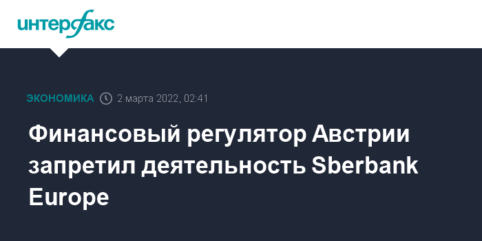 Москва. 2 марта. INTERFAX.RU - Управление по финансовым рынкам Австрии (FMA) запретило Sberbank Europe AG осуществлять деловые операции.