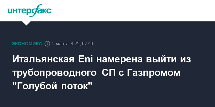 Москва. 2 марта. INTERFAX.RU - Итальянская Eni намерена выйти из совместного предприятия с "Газпромом", которое владеет газопроводом из России в Турцию, "Голубой поток", сообщает агентство ANSA со ссылкой на представителя компании.