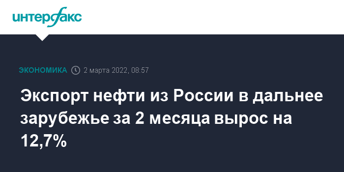Москва. 2 марта. INTERFAX.RU - Экспорт российской нефти в страны дальнего зарубежья в январе-феврале 2022 года составил 36,99 млн тонн, что на 12,7% выше аналогичного показателя 2021 года, сообщается в оперативной сводке ЦДУ ТЭК. Среднесуточный экспорт зафиксирован на уровне 4,6 млн баррелей.