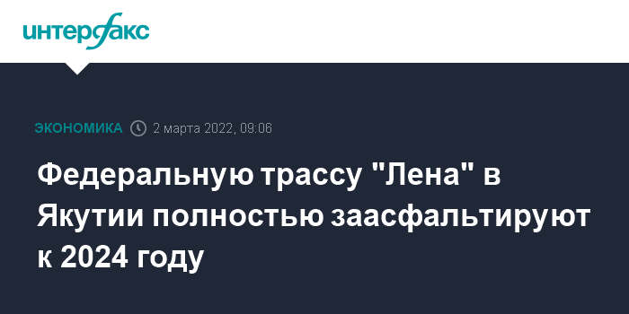 Москва. 2 марта. INTERFAX.RU - Федеральная автодорога А-360 "Лена" (Невер - Якутск) в Якутии станет полностью асфальтобетонной к 2024 году, сообщил глава Росавтодора Роман Новиков через пресс-службу главы и правительства Якутии.