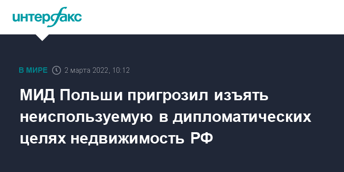 Москва. 2 марта. INTERFAX.RU - МИД Польши обратился к органам общественной администрации с запросом о начале исполнительного производства по передаче двух объектов недвижимости, неиспользуемых Россией в дипломатическо-консульских целях, говорится в коммюнике, размещенном на сайте министерства.
