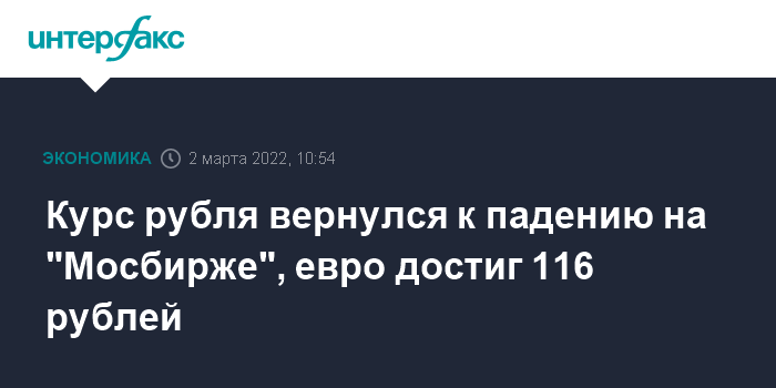 Москва. 2 марта. INTERFAX.RU - После недолгой коррекции курс рубля на "Мосбирже" возобновил падение к доллару и евро. Ситуация на внутреннем валютном рынке остается сильно волатильной из-за санкций против финансовой системы России.