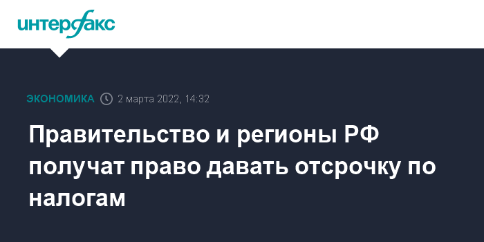Москва. 2 марта. INTERFAX.RU - Правительство РФ и руководители регионов в течение 2022 года смогут продлевать сроки уплаты налогов для поддержки бизнеса и граждан, заявил премьер-министр РФ Михаил Мишустин на заседании кабинета министров.