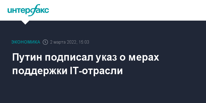 Москва. 2 марта. INTERFAX.RU - На сайте Кремля опубликован указ президента РФ Владимира Путина с перечислением всех вводимых мер поддержки IT-отрасли. Указ вступает в силу со дня опубликования, то есть со 2 марта.