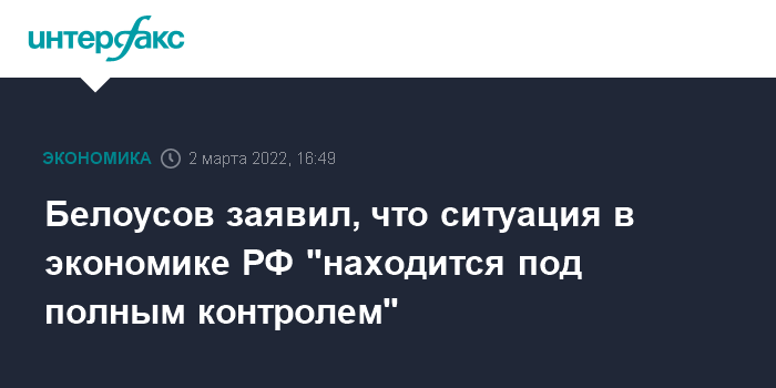Москва. 2 марта. INTERFAX.RU - Ситуация в российской экономике, несмотря на санкции, находится под полным контролем, заявил первый вице-премьер РФ Андрей Белоусов по итогам встречи с РСПП.