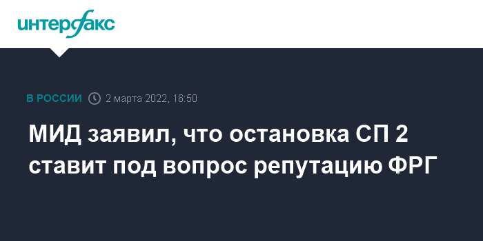 Москва. 2 марта. INTERFAX.RU - Решение ФРГ об остановке проекта "Северный поток 2" нанесет необратимый ущерб российско-германским отношениям, заявили в МИД РФ.