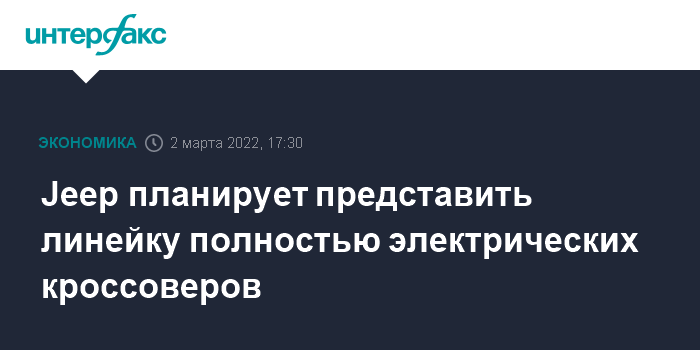 Москва. 2 марта. INTERFAX.RU - Американский автопроизводитель Jeep планирует вывести на рынок новую линейку кроссоверов на полностью электрическом приводе, пишет The Wall Street Journal со ссылкой на заявление Карлоса Тавареса, главы компании Stellantis, которой принадлежит этот бренд.