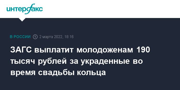 ЗАГС выплатит молодоженам 190 тысяч рублей за украденные во время свадьбы кольца