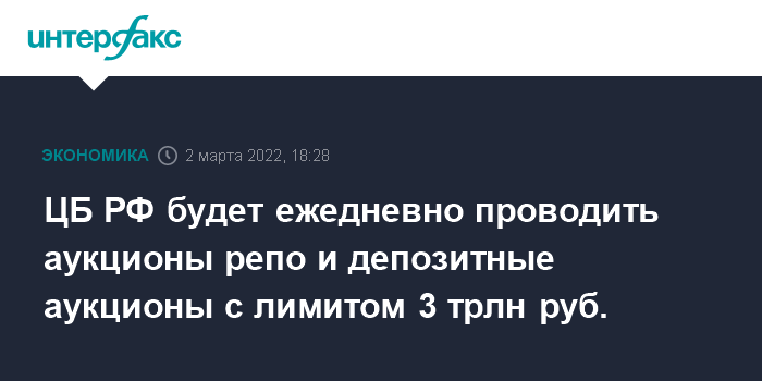 ЦБ РФ будет ежедневно проводить аукционы репо и депозитные аукционы с лимитом 3 трлн руб.