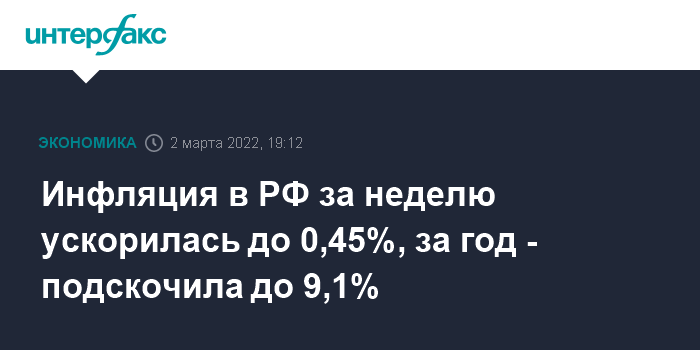 Из этих данных следует, что годовая инфляция в РФ на 25 февраля значительно выросла и была в районе 9,1% (с 8,84% на 18 февраля, 8,75% на 11 февраля, 8,80% на 4 февраля, 8,73% на конец января и 8,39% на конец декабря).
