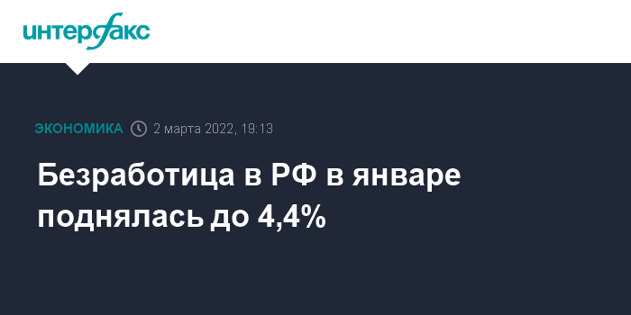 Москва. 2 марта. INTERFAX.RU - Безработица в России в январе повысилась до 4,4% после того, как течение четырех месяцев оставалась на уровне 4,3%, следует из опубликованных в среду данных Росстата.