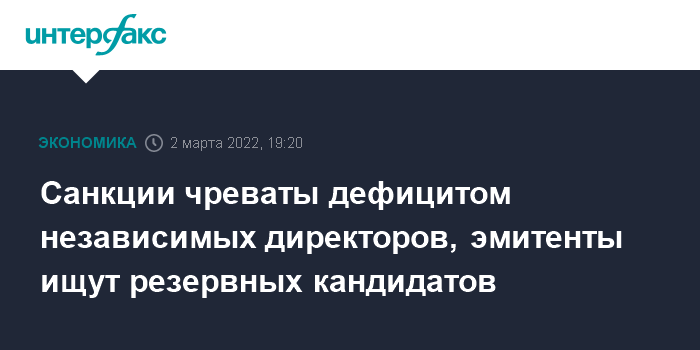 Собеседник "Интерфакса" в одной из публичных компаний сказал, что проблема, связанная с необходимостью поддержания эффективно работающих советов директоров, усугубляется сейчас тем, что из них выбывают и российские бизнесмены, попавшие под санкции. Причем часто это собственники бизнеса, отметил он.