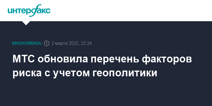 Москва. 2 марта. INTERFAX.RU - Бизнес ПАО "МТС" в целом устойчив к потенциальному влиянию последствий от текущих геополитических событий, но компания допускает, что на деятельность и финансовые показатели группы могут повлиять, в том числе, дальнейшее продление санкций и ограничение деловых и торговых отношений.
