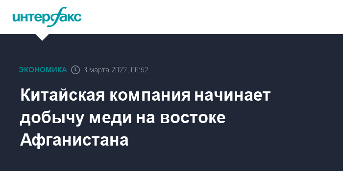 Москва. 3 марта. INTERFAX.RU - Китайская компания MCC в ближайшие дни начнет добычу меди на месторождении в провинции Логар на востоке Афганистана, сообщил в четверг представитель движения "Талибан" (запрещенная в России террористическая организация) Вардак Алханафи.