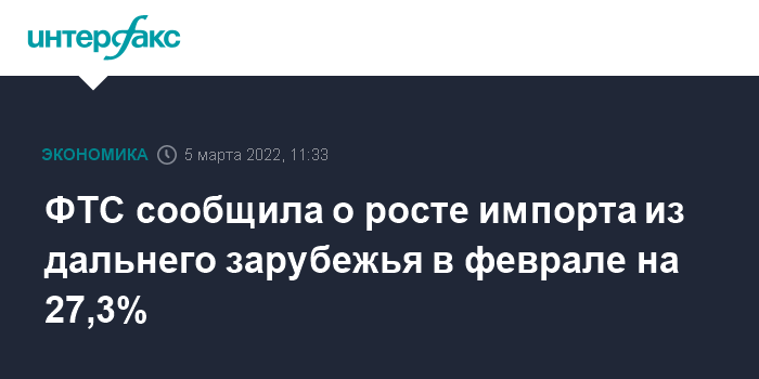 В феврале 2022 года стоимостный объем импорта товаров из стран дальнего зарубежья составил $23 575,2 млн, увеличившись на 27,3% по сравнению с февралем 2021 года. В январе 2022 года, как сообщалось, импорт вырос в годовом выражении на 37,2%.