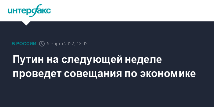 Москва. 5 марта. INTERFAX.RU - Президент РФ Владимир Путин на следующей неделе планирует провести совещания по экономике, сообщил его пресс-секретарь Дмитрий Песков.