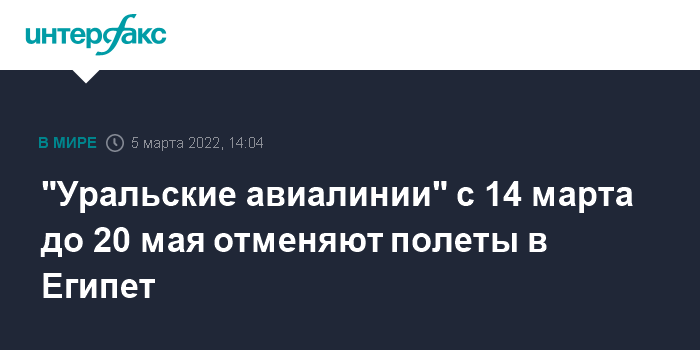 Москва. 5 марта. INTERFAX.RU - Авиакомпания "Уральские авиалинии" с 5 по 13 марта будет осуществлять только вывозные рейсы из Египта, с 14 марта полетная программа в Египет будет отменена как минимум до 20 мая 2022 года, говорится в сообщении авиаперевозчика.