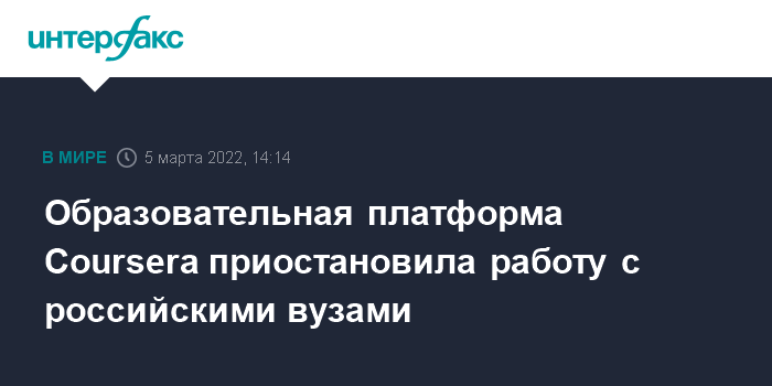 Москва. 5 марта. INTERFAX.RU - Американская Coursera Inc, оператор образовательной онлайн-платформы, приостанавливает сотрудничество с вузами РФ в связи с событиями на Украине, говорится в сообщении компании.