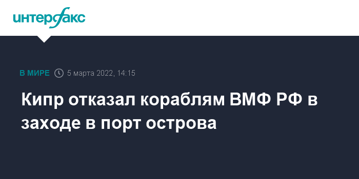 Москва. 5 марта. INTERFAX.RU - Республика Кипр отозвала свое разрешение на планировавшийся заход кораблей ВМФ России в порт Лимасол, сообщила в субботу кипрская газета "Филелефтерос", ссылаясь на дипломатические источники.