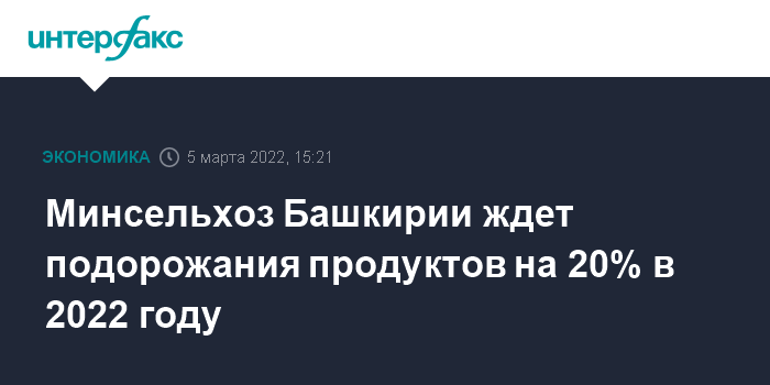 Москва. 5 марта. INTERFAX.RU - В Башкирии в рознице продукты из-за санкций могут подорожать в 2022 году в среднем на 20%, заявил "Интерфаксу" заместитель министра сельского хозяйства региона Юрий Лысов.