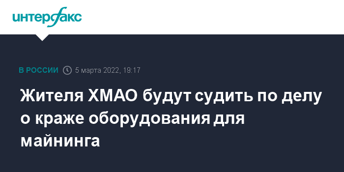 Москва. 5 марта. INTERFAX.RU - В Ханты-Мансийском автономном округе в суд поступит дело о краже оборудования для майнинга криптовалюты на сумму более 2,7 млн рублей, сообщила прокуратура региона.
