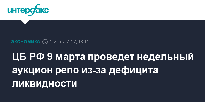 Москва. 5 марта. INTERFAX.RU - ЦБ РФ в связи с формированием в банковском секторе структурного дефицита ликвидности 9 марта 2022 года проведет аукцион репо со сроком размещения средств на одну неделю, говорится в сообщении регулятора.