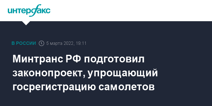 Москва. 5 марта. INTERFAX.RU - Минтранс РФ разработал законопроект, упрощающий процедуру государственной регистрации прав на воздушные суда.