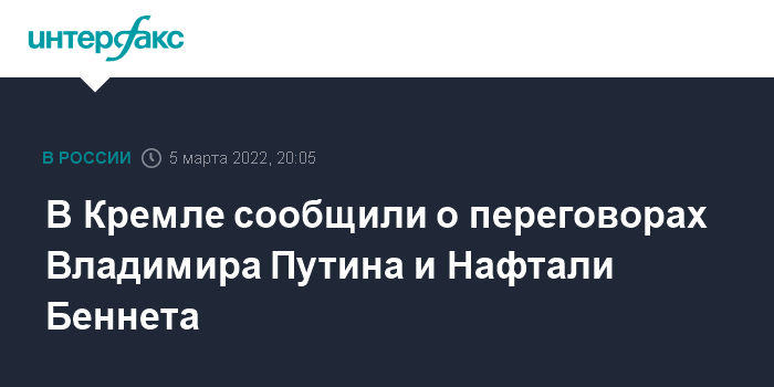 Москва. 5 марта. INTERFAX.RU - В Кремле сейчас проходят переговоры президента России Владимира Путина и премьер-министра Израиля Нафтали Беннета, который прибыл в Москву с кратким рабочим визитом, сообщил пресс-секретарь президента РФ Дмитрий Песков.