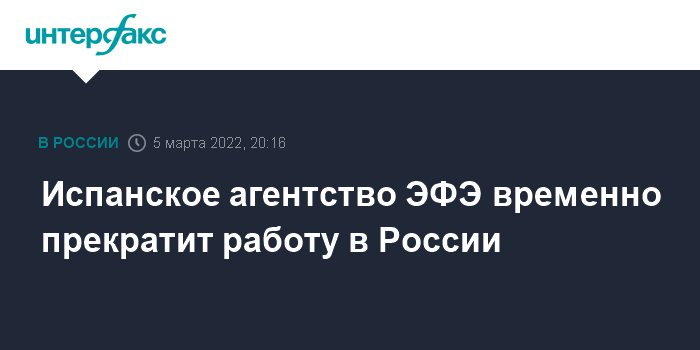 Москва. 5 марта. INTERFAX.RU - Испанское информационное агентство ЭФЭ объявило в субботу о временном прекращении работы в России.