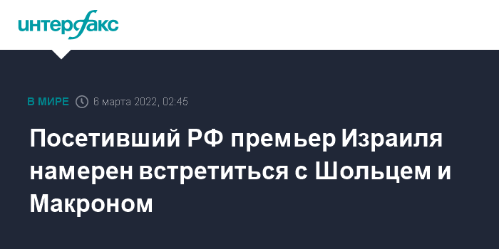 Москва. 6 марта. INTERFAX.RU - Премьер Израиля Нафтали Беннет, в субботу посетивший Россию, может в ближайшее время провести переговоры с лидерами ФРГ и Франции, сообщает Jerusalem Post.