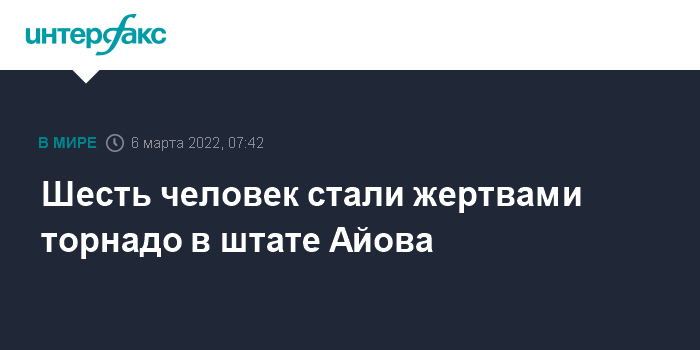 Москва. 6 марта. INTERFAX.RU - Торнадо в американском штате Айова унес в субботу жизни шести человек - двух взрослых и четверых детей, сообщило агентство Associated Press со ссылкой на власти.