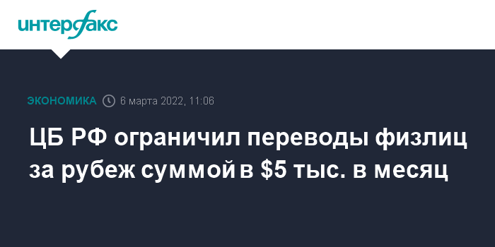 Москва. 6 марта. INTERFAX.RU - Банк России вводит ограничение в $5 тысяч в месяц на перевод за рубеж денежных средств физлицами - резидентами другим резидентам РФ, а также физлицами - нерезидентам, в том числе родственникам. Соответствующее предписание он дает уполномоченным банкам в связи с повышенной волатильностью на валютном рынке.