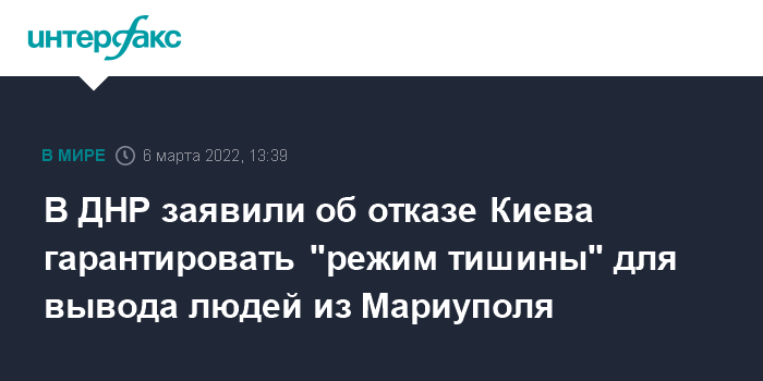 Москва. 6 марта. INTERFAX.RU - Украинская сторона отказалась гарантировать соблюдение "режима тишины" для обеспечения выхода мирных жителей по гуманитарным коридорам из Мариуполя, сказал журналистам представитель народной милиции ДНР Эдуард Басурин в интервью телеканалу "Россия-1" (ВГТРК).