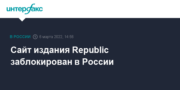 Москва. 6 марта. INTERFAX.RU - Сайт издания Republic (внесен Минюстом РФ в реестр СМИ-иноагентов) заблокирован на территории России, следует из данных Роскомнадзора.