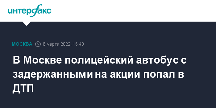 Москва. 6 марта. INTERFAX.RU - Полицейский автобус с задержанными за участие в несанкционированном мероприятии в Москве попал в аварию, есть пострадавшие, сообщили в воскресенье в пресс-службе столичного управления МВД.