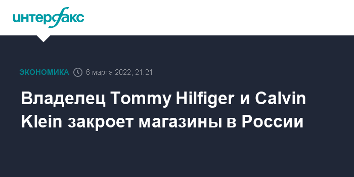 Москва. 6 марта. INTERFAX.RU - Американская PVH Corp., владеющая брендами Tommy Hilfiger, Calvin Klein, Warner's и др., приняла решение временно закрыть свои магазины и приостановить все коммерческие операции в РФ и Белоруссии с 7 марта, сообщила компания в своих соцсетях.