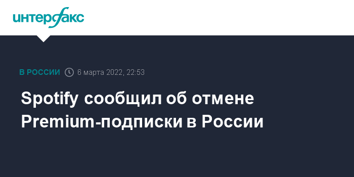 Москва. 6 марта. INTERFAX.RU - Музыкальный сервис Spotify объявил, что его Premium-подписка больше недоступна для приобретения в России.