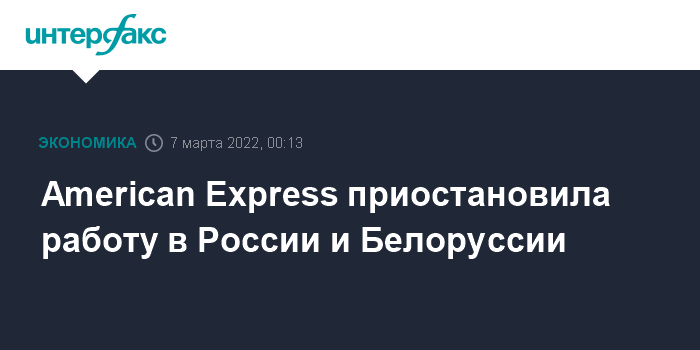 "В результате карты American Express, выпущенные по всему миру, больше не будут работать в магазинах или банкоматах в России. Кроме того, карты, выпущенные в России российскими банками, больше не будут работать за пределами страны в глобальной сети American Express. Мы также приостанавливаем все бизнес-операции в Белоруссии", - говорится в заявлении.