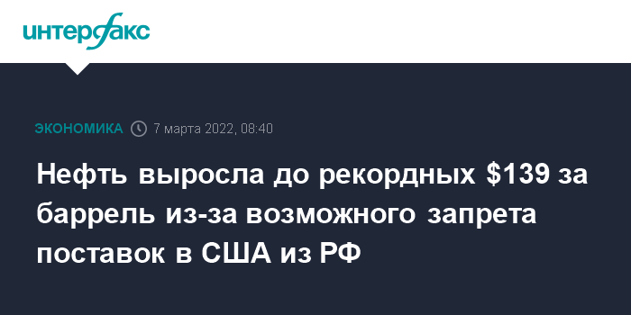 Нефть выросла до рекордных $139 за баррель из-за возможного запрета поставок в США из РФ